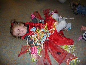 Wat een lieve bees ben jij Lieke! Wauw! In de optocht zijn we met z’n allen naar de gymzaal gegaan. Lieke heeft er flink feest gevierd en vriendinnetjes gemaakt met meisjes van de Zeesterren en de Pinguins. Ze drentelden steeds om Lieke heen en ze vond het prachtig. Samen met Diego heeft Lieke gespeeld met de serpetines en heeft ze muziek gemaakt. Met rode wangen gingen we terug naar de groep.