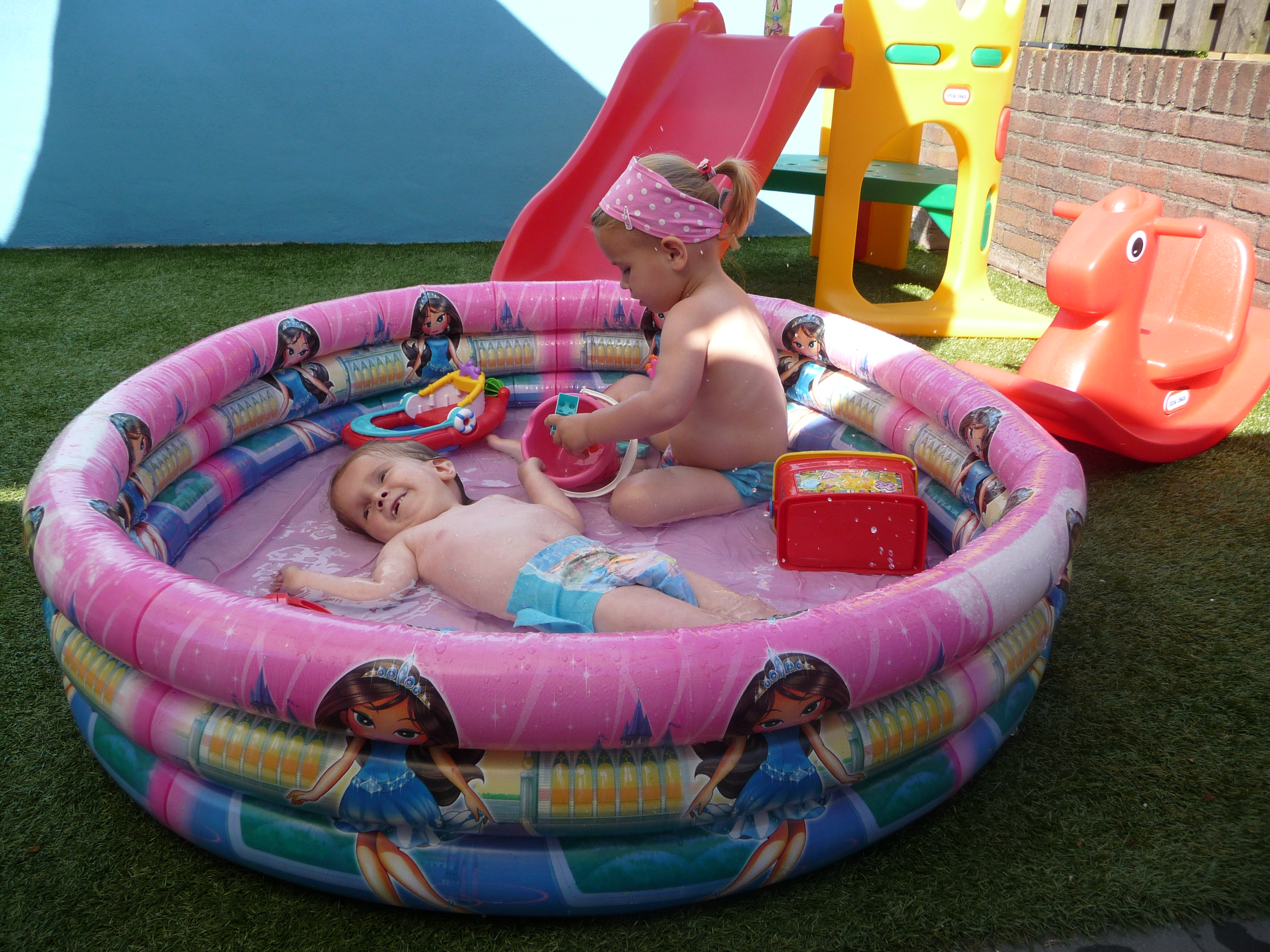 Op woensdag komt heel vaak Renee een paar uurtjes met Lieke spelen, dolle pret. Gisteren zijn Renee en Lieke eerst samen naar de kinderboerderij geweest. Daarna was het waterpret thuis met Guusje!