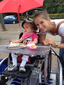 Zaterdagochtend lekker rustig aan gedaan. ’s Middags kwam Anne even met Lieke spelen. En aangezien Anne ervaring heeft met fietsen op de rolstoeltransporter door haar werk bij het logeerhuis mocht een fietstochtje niet ontbreken.