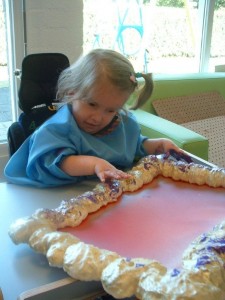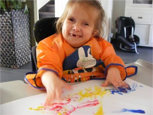 Gisteren en vandaag flink gezoefd! De pasjes worden steeds regelmatiger. In een half uur komt ze van de fysiotherapieruimte tot bij de ballenbak!! (IJsbeertjes).