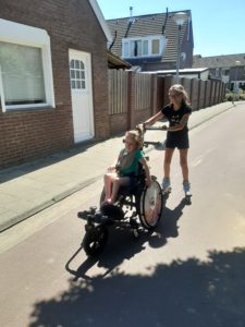De dagen erna heeft Lieke genoten van het heerlijke weer. Lief om te zien hoe Guusje haar af en toe betrekt in haar spel. ‘Mam, mag Lieke mee naar het schoolplein?’. En daar gaan ze…Guusje op haar skeelers achter de rolstoel. Lieke geniet! En wat ben ik trots op Guusje!