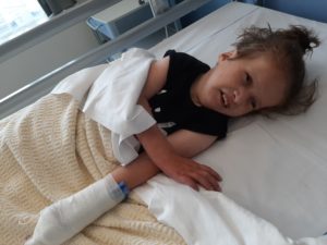 Op de kinderdagbehandeling een warm welkom. Even fijn bij praten met iedereen. De beste prikkers zijn ingezet om Liekes infuus te prikken…helaas, 4 pogingen waren nodig 🙁 Wat een verdriet en boosheid bij Lieke..gelukkig ging ze uiteindelijk rustig slapen. Tijdens de sedatie had Lieke moeite met haar saturatie op peil te houden. De extra zuurstof was niet overbodig. Terwijl Lieke sliep zijn er ook 9 buisjes bloed afgenomen. Dit om onder andere haar stolling te onderzoeken. Dit allemaal omdat de puberteit er aan begint te komen. Dit tweede infuus heeft ze gelukkig niet gemerkt.
