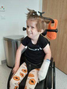 Ze werd rustig wakker. Even face timen met papa en Guusje zorgde voor een glimlach. En als Lieke dan wakker is, wil ze al snel gewoon in de rolstoel en lekker eten en drinken. Bikkel!
